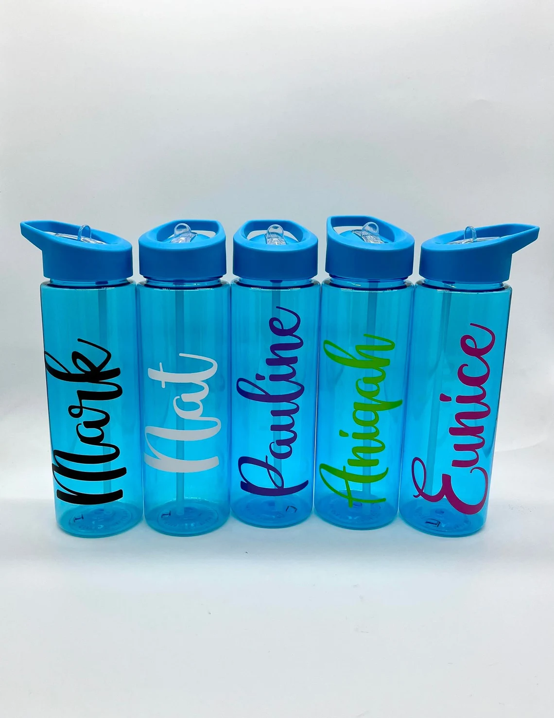 Each bottle is personalised with your name in a swirly style colourful vinyl.