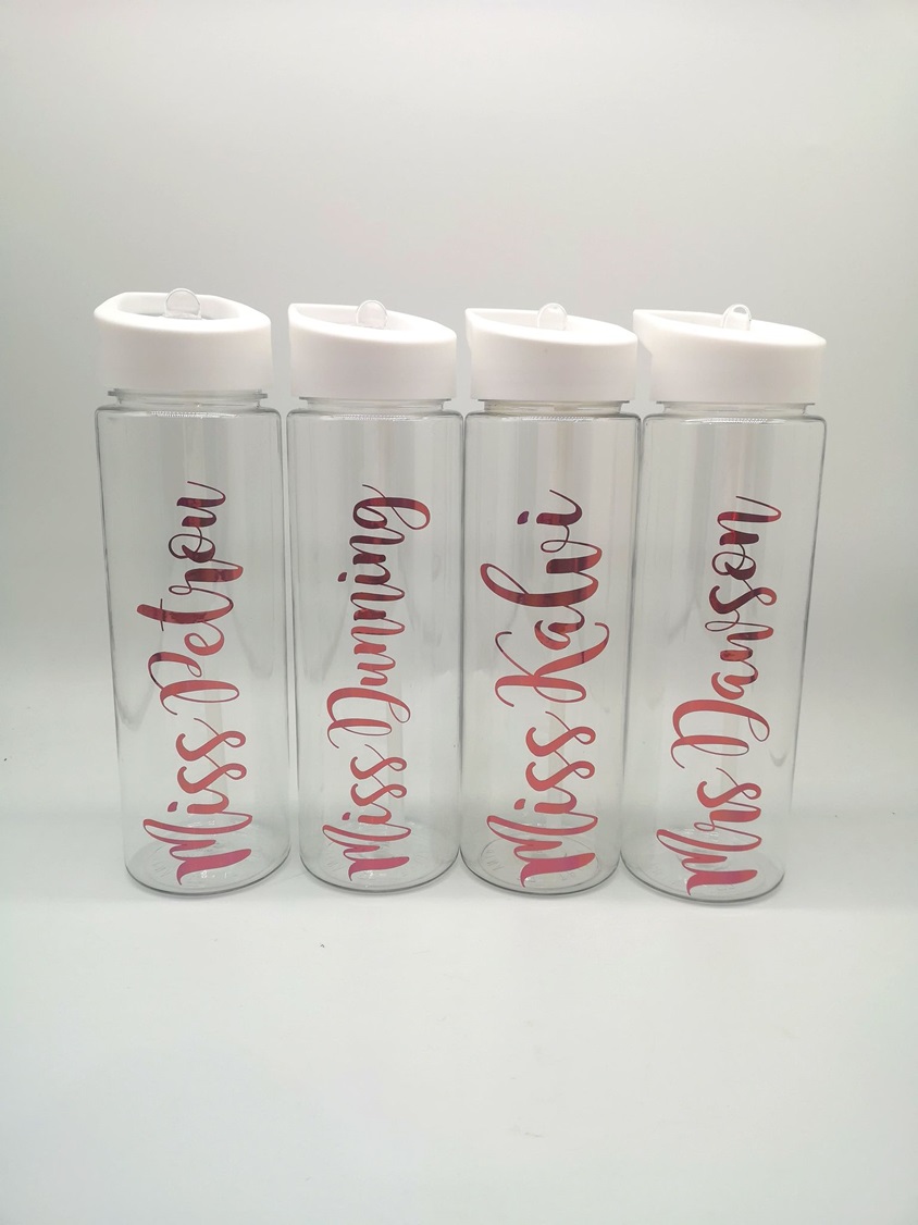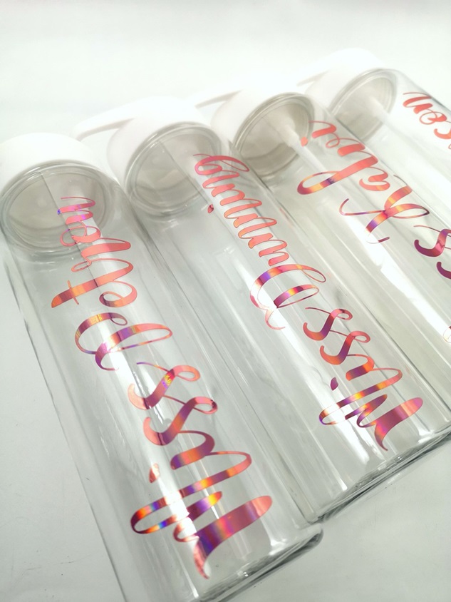 Each bottle is personalised with stick on permanent adhesive vinyl, with your name and in a vinyl colour of your choice.